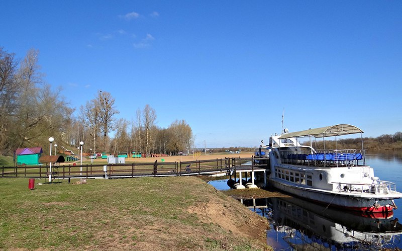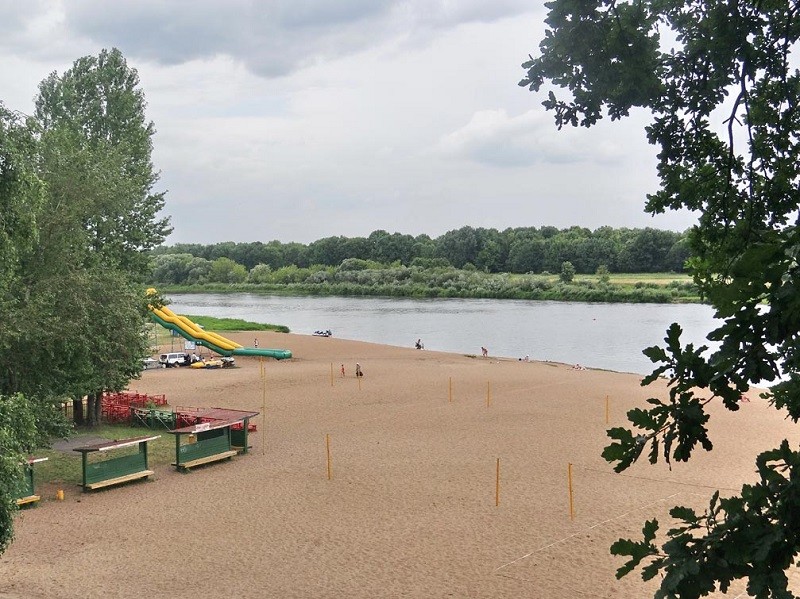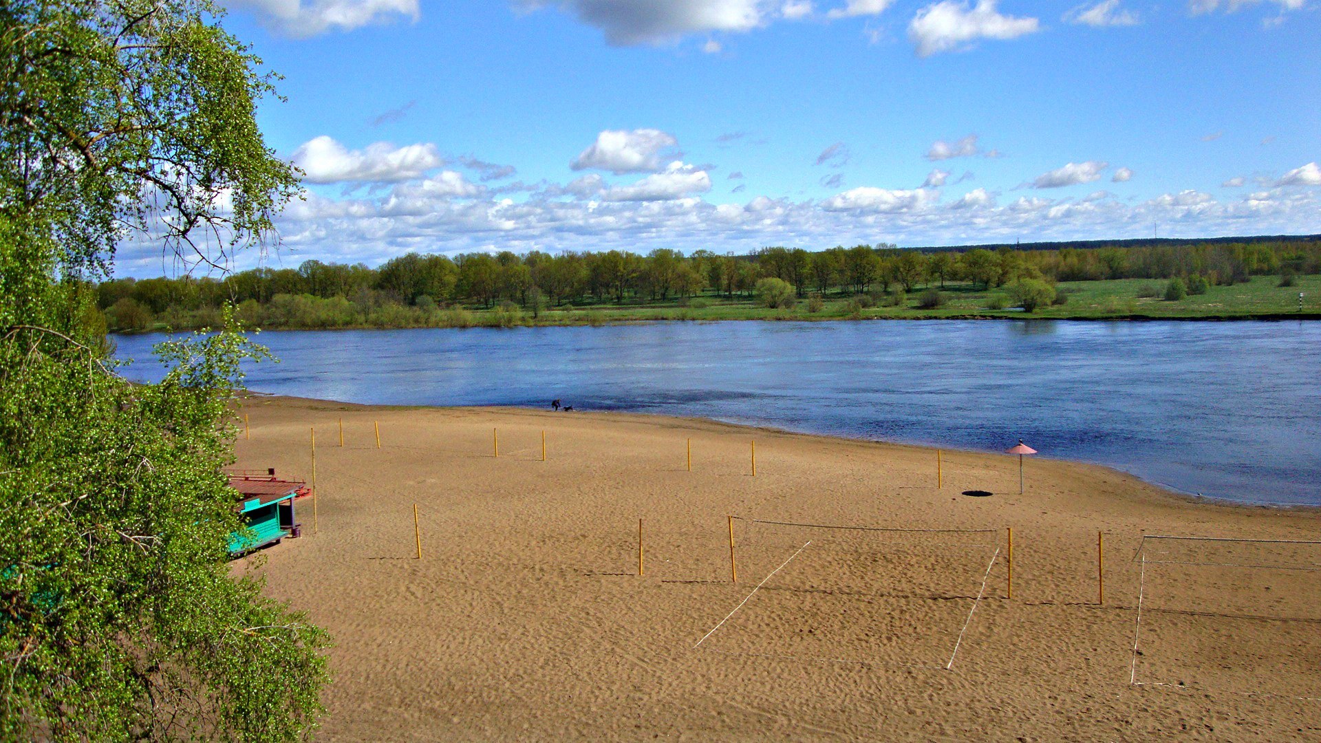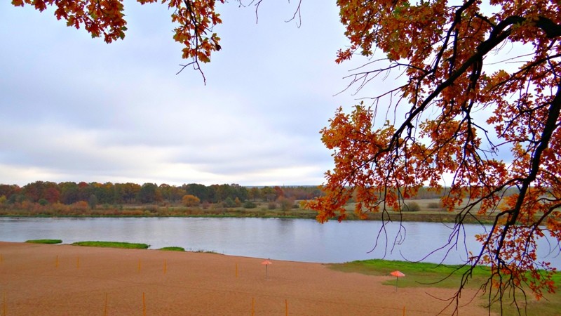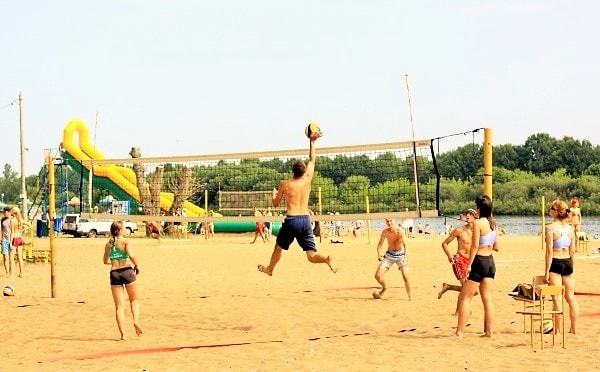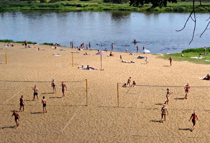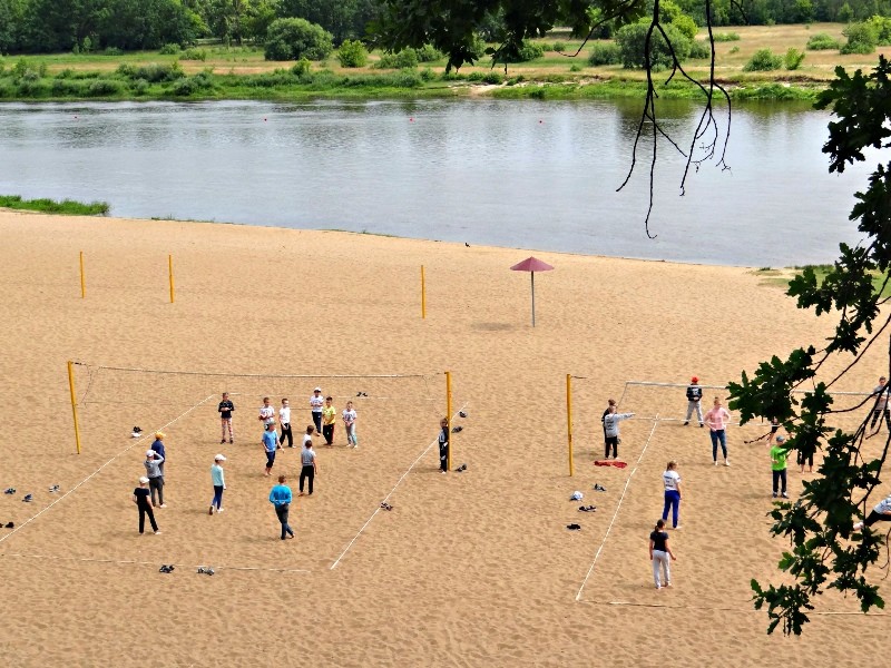 На берегу реки есть собственный оборудованный пляж с кабинками для переодевания, грибками, волейбольной площадкой